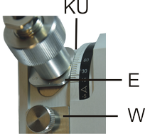 ![]() | Die drei Schleifbahnen auf der Diamantscheibe werden durch einfaches versetzen des Führungselementes (E) und verschieben der Kulisse (KU) eingestellt. Der Schleifwinkelanschlag (W) ermöglicht ein wiederholendes Anschleifen unter gleichen Bedingungen bei 15° bis 75°. |