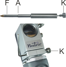 ![]() | Die genaue Führung (F) und der Anschlag (A) am Elektrodenhalter garantieren einen präzisen Schliff in Längsrichtung. Die Grundeinstellung der Tiefenlehre wird durch die Kalibrierschraube (K) ermöglicht. |