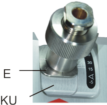 ![]() | Die drei Schleifbahnen auf der Diamantscheibe werden durch einfaches versetzen des Führungselementes (E) und verschieben der Kulisse (KU) eingestellt. |