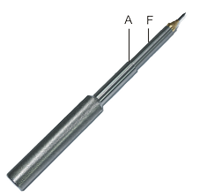 ![]() | Die genaue Führung (F) und der Anschlag (A) am Elektrodenhalter garantieren einen präzisen Längsschliff. |