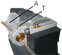 ![]() | Mit der Trenneinheit (T) können Wolframelektroden auf die gewünschte Länge getrennt werden. Abgetrennte Elektrode befindet sich im Auffangbehälter (A) |